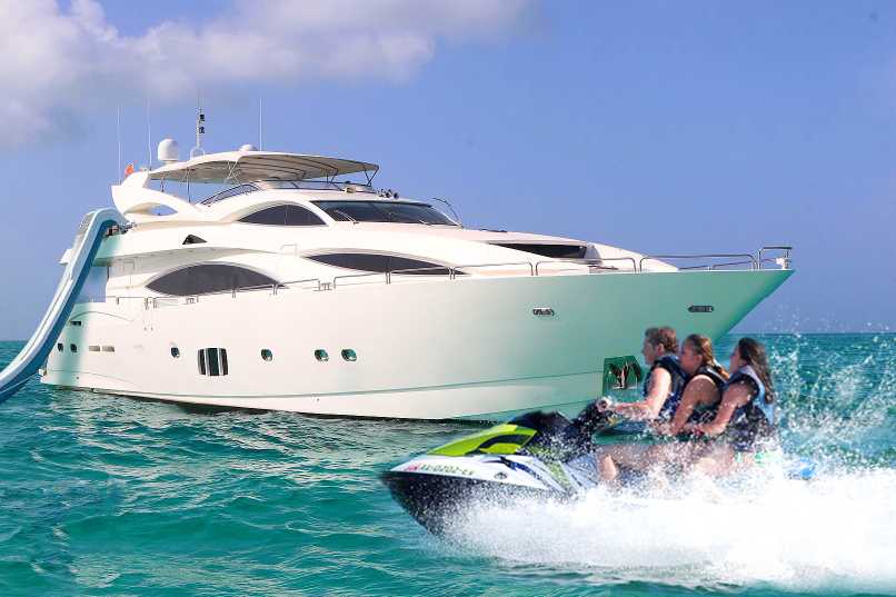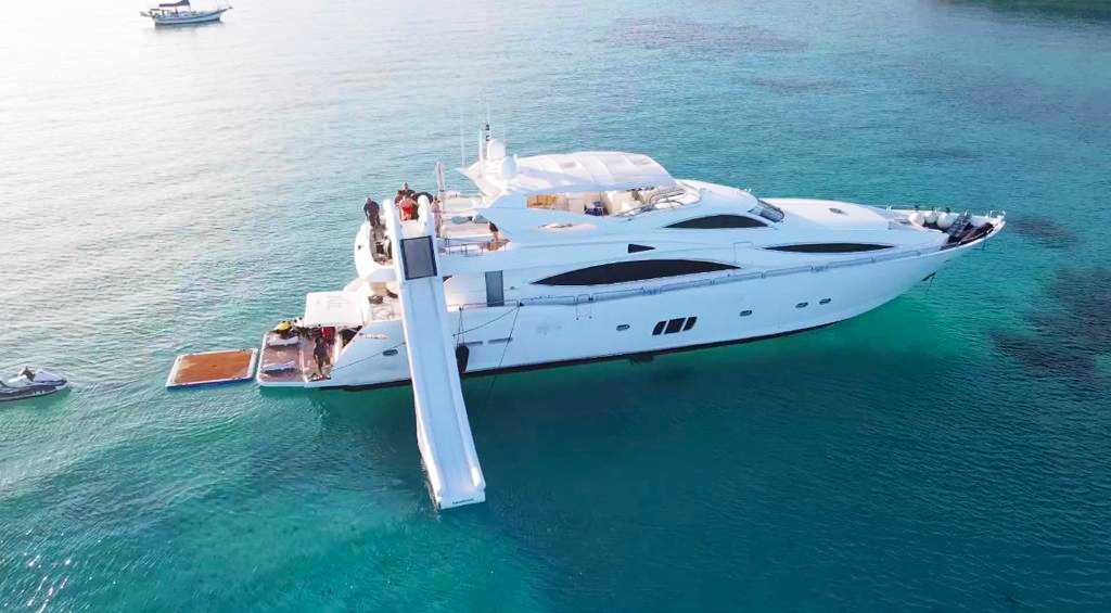 The Sunseeker's five-star experience is underpinned by a crew of five, including a skilled chef ready to cater to your culinary whims, turning each meal into an event in itself. Above deck, indulge in the opulence of a soothing jacuzzi, or embrace the thrill of the ocean with our state-of-the-art stabilizers that promise smooth sailing. The swim platform and slide offer exhilarating access to the turquoise waters, where you can dive into fun with our full-size jet-skis, seabobs, and an array of fishing and snorkeling gear.